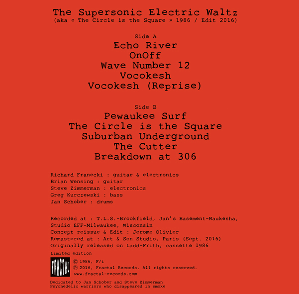 ------------------------------------------------------------------------------------------------------------------------------------------------------------------The years 1985/1986 are the turning point in F/i sound evolution, and particularly with their cassette “The Circle Is the Square” released in 1986 on Brian Ladd and Julie Frith label (a duo responsible of the band Psyclones). The group is then composed by five members: Richard Franecki (guitar, electronics), Brian Wensing (guitar), Steve Zimmerman (electronics), Greg Kurczewski (bass) and Jan Schober (drums). In fact, with insight, this tape is a formidable lost forgotten masterpiece of space-punk rock, a true gem of the genre !!! “one of my personal favorites” wrote Jerry Kranitz of Aural Innovations on his article in Shindig! magazine. I bought the cassette around the same time when I purchased my copy of the F/i second album “Space Mantra” (released on the well-known label RRRecords) late 80’s, and I should well admit today that “The Circle Is the Square” is one of their best realization in their entire discography for sure ! For the 30th anniversary, Fractal presents “The Supersonic Electric Waltz” a new edit and remastered 2016 version of “The Circle Is the Square” cassette on vinyl LP for this special and unique reissue. In summary, yes this new edit is shorter than the original version, but the final impression with just the ten tracks selected here brings to the reissue a much more powerful impact than the full cassette tape as its look like you have just 2 long tracks non-stop and speed with spacey music on each side, just fantastic. It’s a blast! All the highlights are included: the Hawkindnesque ‘vintage 72’ “OnOff”, the awesome garage punker ala Sonics “Pewaukee Surf”, without forget of course the jewel, THE “F/i” tune “The Circle Is the Square” one of their best ever !! A reworked version have been done later by Vocokesh (Richard Franecki’s other band) but the best rendition of this number is here definitely (nb : the version on “The Past Darkly/The Future Lightly” triple LP boxset & double CD reissue with the track “The Cutter” suffered from poor sound quality !) or even “Wave Number 12” with this great guitar battle duo, so trippy… but at last all tracks should not to be missed as only the complete set played “altogether” formed this great and solid unity ! Half century ago SPACEROCK was born, thank you Syd Barrett, you know the man who have composed “Astronomy Domine”… If Pink Floyd “The Piper at the Gates of Dawn” and Hawkwind “Space Ritual” are the two ultimate spacerock album masterpieces released in their respective decade 60’s & 70’s, F/i and Spacemen 3 are probably the key bands for the 80’s spacerock !? But Nik Turner (yeah thanks a lot for “Brainstorm” Nik !) with Inner City Unit and later with his own “Space Ritual Live 1994” (and not surprisingly again with Genesis P-Orridge and Helios Creed as tour member !) have well maintained the Spacerock flame and so, it wasn’t a surprised to see F/i played at the Strange Daze festival in august 1997 (America first spacerock festival) with naturally the legendary Nik Turner and Hawkwind !! This is NOT your captain speaking but If you are into Spacerock, Krautrock, Garage Punk…this “Supersonic Electric Waltz” should keep your attention, absolutely ! And do not panic, this is just a limited edition of 99 copies (and comes with a bonus CDr), so obviously…you know what you should do now… it’s so easy… If you shouldn’t do that… oh well… remember that you are welcome to the F(uture) / ! Groupe underground