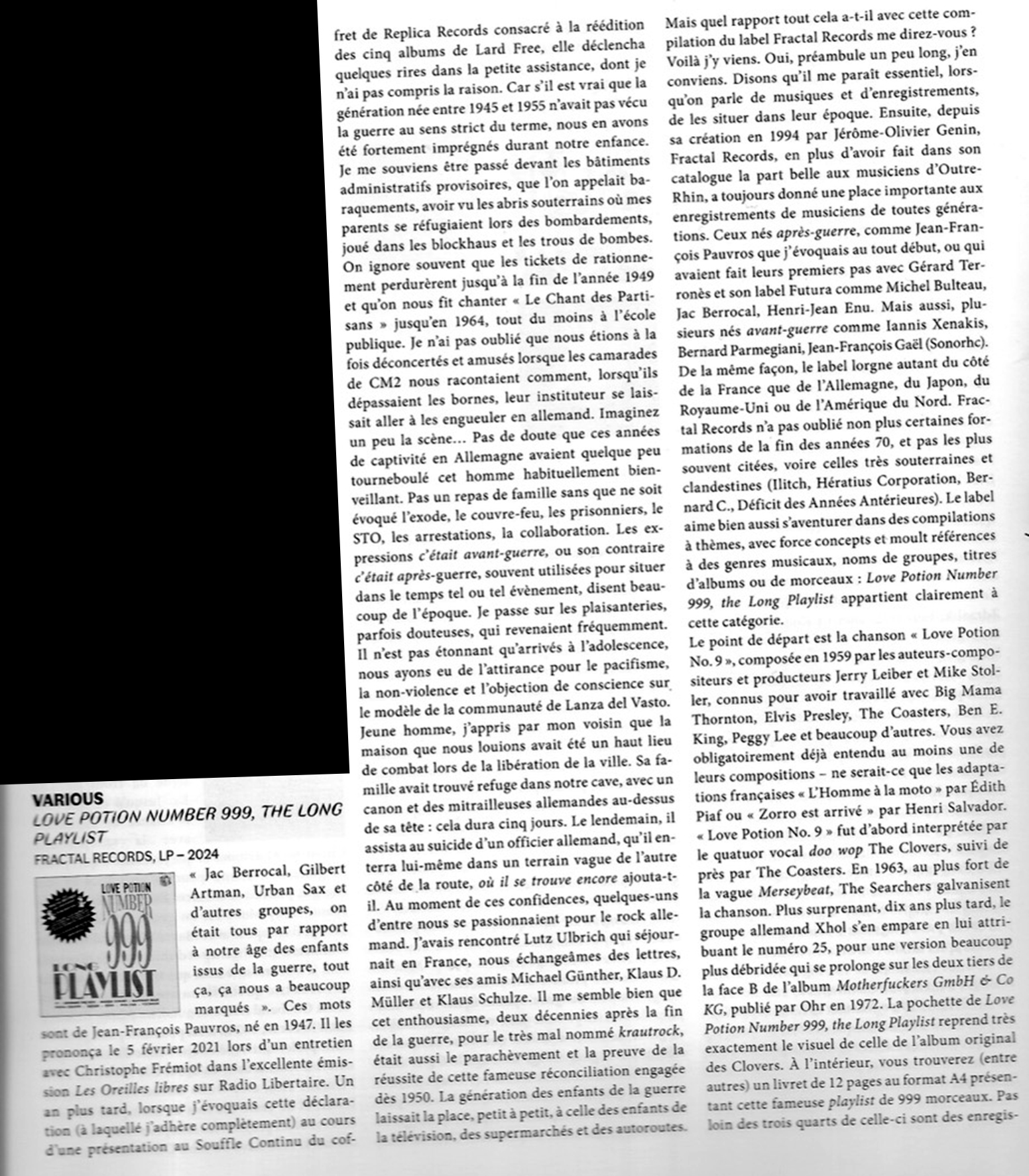 - BLACK Vinyl (150 copies with 2 inserts : 1 color insert 30x30cm 150gr. + 1 booklet 12 pages, color-B&W A4 format) Once is not custom, Fractal Records is celebrating an anniversary for the first time in its history, but not just any anniversary, its 30th. For this commemoration, Fractal Records presents: « Love Potion Number 999 aka the Long Playlist - The Big Bubble Party » a compilation: - Conceptual, centered on an album cover and a song by The Clovers for the theme with the number 9 as a highlight. - Eclectic, to remain in perfect harmony with the label’s editorial line since its creation. - International, where 9 artists/groups are obviously on the menu: F/I (USA), The Legendary Pink Dots (UK/Netherlands), Musique Concret (UK), Mahogany Brain (France), Pascal Chassin (France), Karaba (Germany), DDAA (France), Diza Star (Japan), Vocokesh (USA). Fractal Records is an independent label created in September 1994