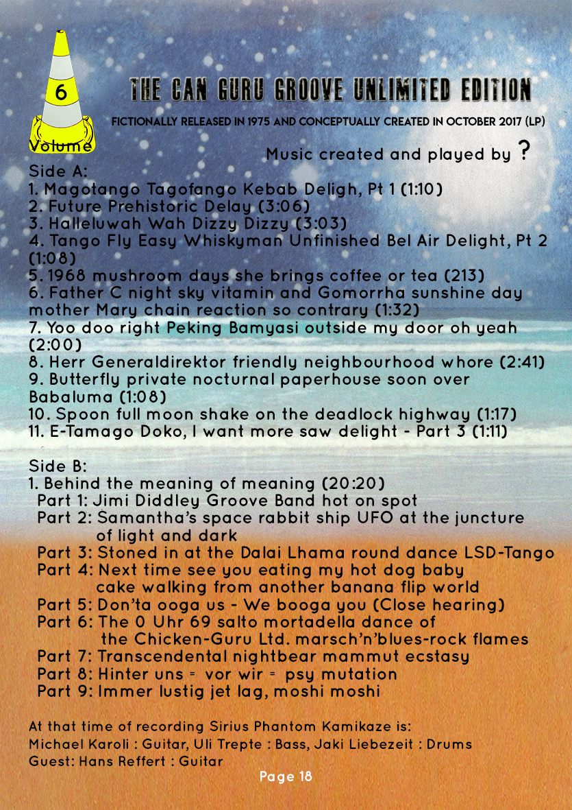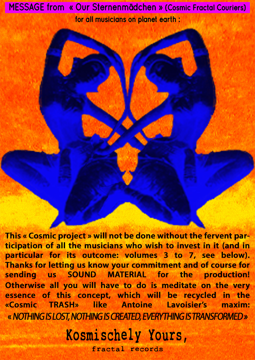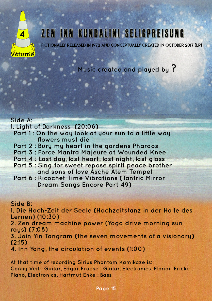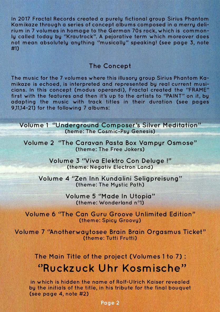 « Ruckzuck Uhr Kosmische » and « Sirius Phantom Kamikaze » is the name of the fictional band of this series for the common thread of the journey: « The ultimate magic ‘’no return’’ trip to activate your BRAIN only ». |
