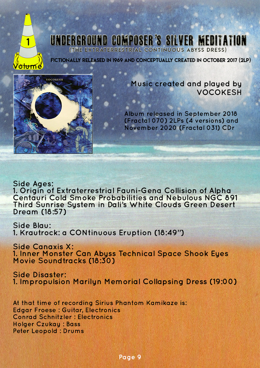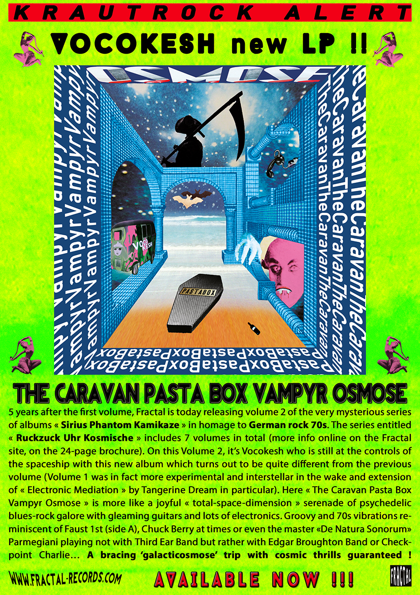 (Sirius Phantom Kamikaze Vol.2) 5 years after the first volume, Fractal is today releasing volume 2 of the very mysterious series of albums « Sirius Phantom Kamikaze » in homage to German rock 70s. The series entitled « Ruckzuck Uhr Kosmische » includes 7 volumes in total (more info below "April 2023 News" on the 24-page brochure). On this Volume 2, it’s Vocokesh who is still at the controls of the spaceship with this new album which turns out to be quite different from the previous volume (Volume 1 was in fact more experimental and interstellar in the wake and extension of « Electronic Mediation » by Tangerine Dream in particular). Here « The Caravan Pasta Box Vampyr Osmose » is more like a joyful « total-space-dimension » serenade of psychedelic blues-rock galore with gleaming guitars and lots of electronics. Groovy and 70s vibrations reminiscent of Faust 1st (side A), Chuck Berry at times or even the master « De Natura Sonorum » Parmegiani playing not with Third Ear Band but rather with Edgar Broughton Band or Checkpoint Charlie… A bracing ‘galacticosmose’ trip with cosmic thrills guaranteed ! Français 5 ans après le 1er volume, Fractal sort aujourd’hui le volume 2 de la très mystérieuse série d’albums « Sirius Phantom Kamikaze » en hommage au Rock Allemand des 70s. La série titrée « Ruckzuck Uhr Kosmische » comprend 7 volumes au total (plus d’info dessous "April 2023 News" sur la brochure de 24 pages). Sur ce volume 2, c’est Vocokesh qui est encore au commande du vaisseau spatial avec ce nouvel album, qui se révèle assez diffèrent du précédent volume (Le Volume 1 était en effet plus expérimental et interstellaire dans le sillage et le prolongement de Tangerine Dream « Electronic Mediation » notamment). Ici « The Caravan Pasta Box Vampyr Osmose » ressemble plus à une joyeuse sérénade « total-space-dimension » de blues rock psychédélique à gogo aux guitares rutilantes avec beaucoup d’électronique. Ambiances groovy et vibrations 70s rappelant le premier Faust (side A), Chuck Berry par moment ou encore le maître « De Natura Sonorum » Parmegiani jouant non pas avec Third Ear Band mais plutôt avec Edgar Broughton Band ou Checkpoint Charlie… Un vivifiant ‘galacticosmose’ trip avec frissons cosmiques garantie ! |